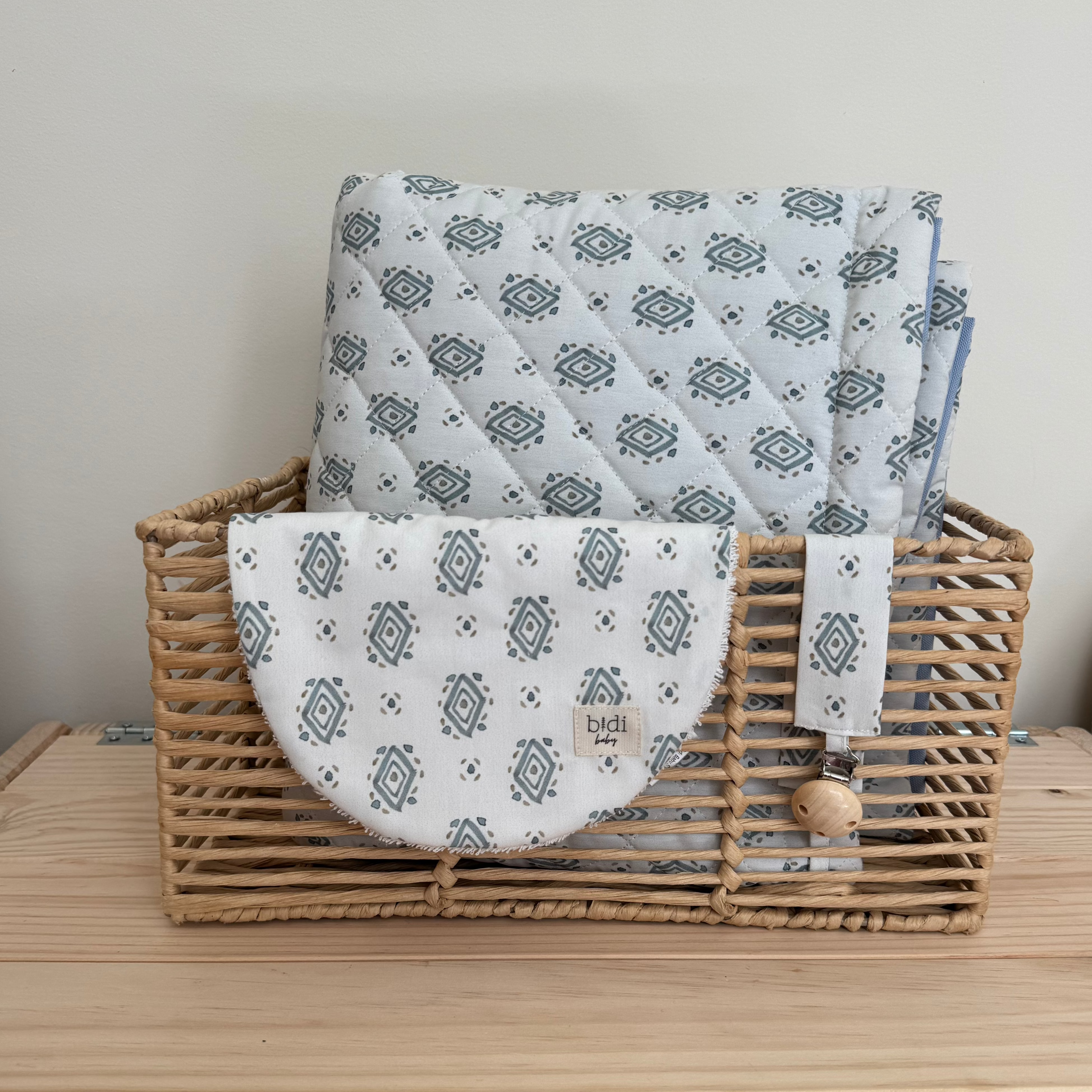 Bidi es la manta de juego ideal tanto para exterior como para interior. Acolchada y de algodón 100% por un lado e impermeable por el otro.