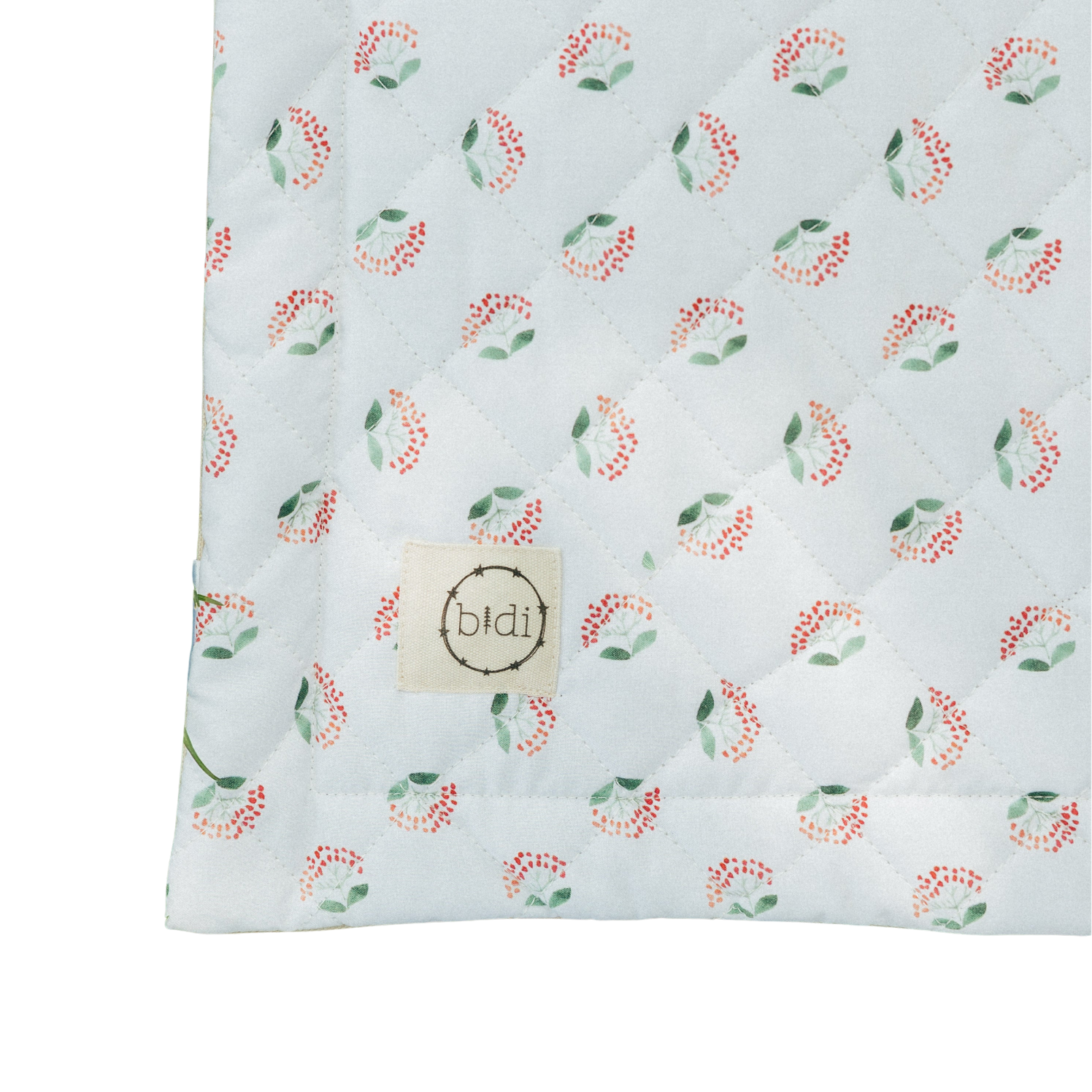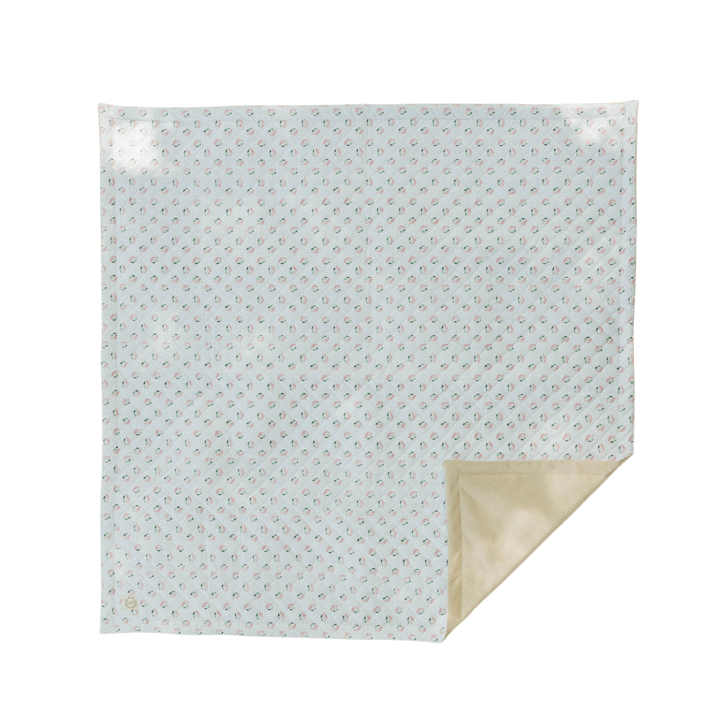 Play blanket with floral print in red, pink and green tones with a beige background at the bottom.