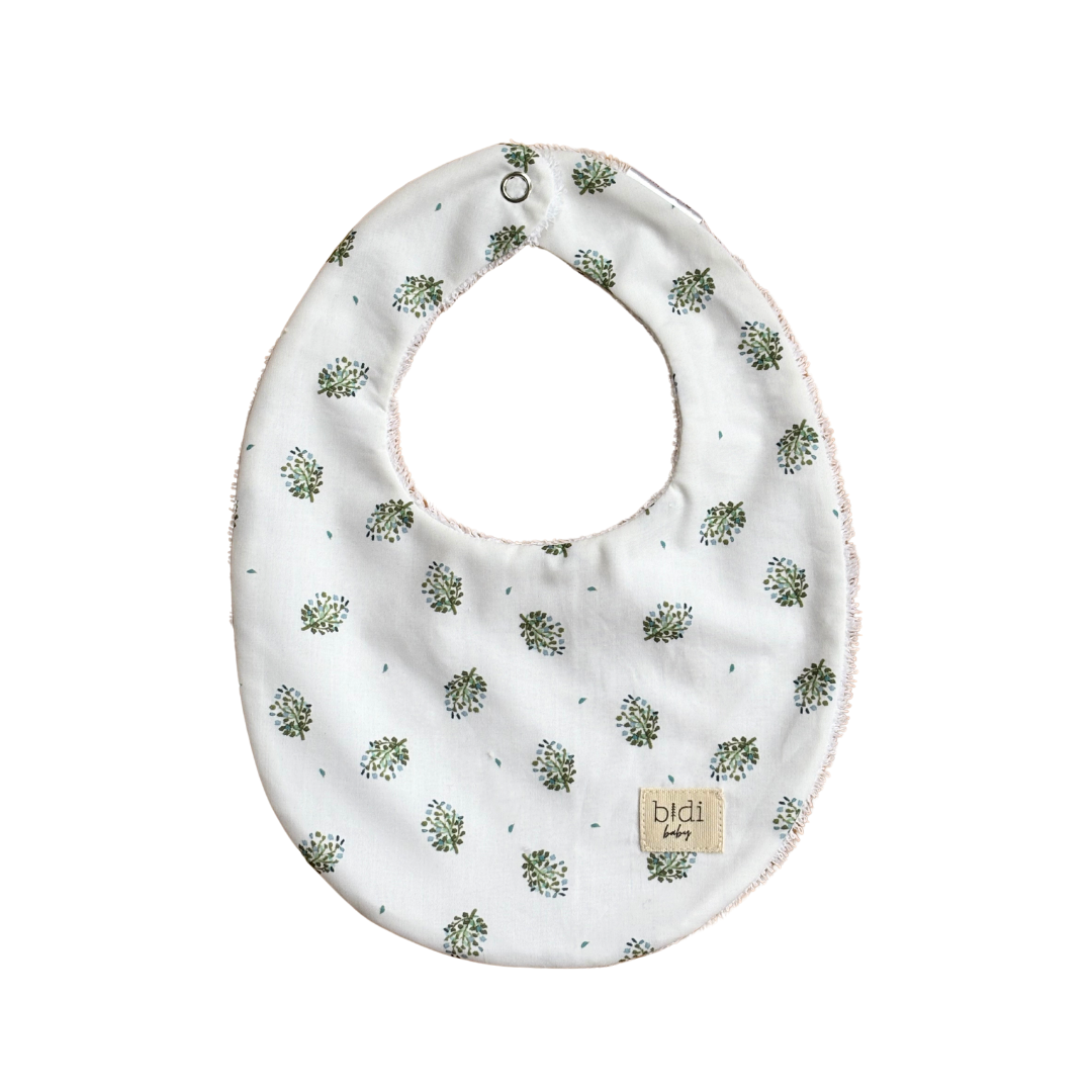 El detalle perfecto para regalar. Babero infantil confeccionado en algodón y diseñado con estampado de flores en tonos verdes y azules. Con rizo en su parte inteior.