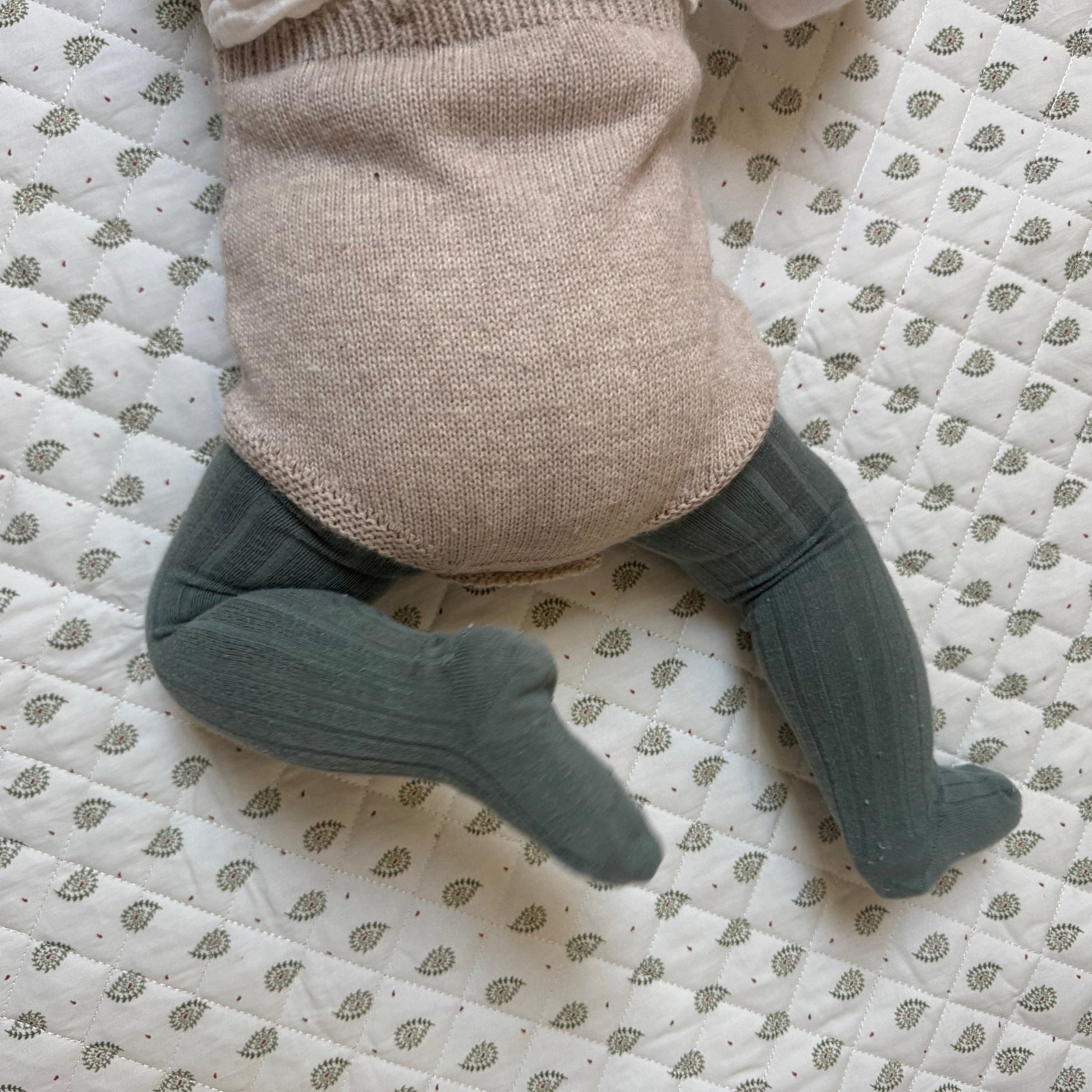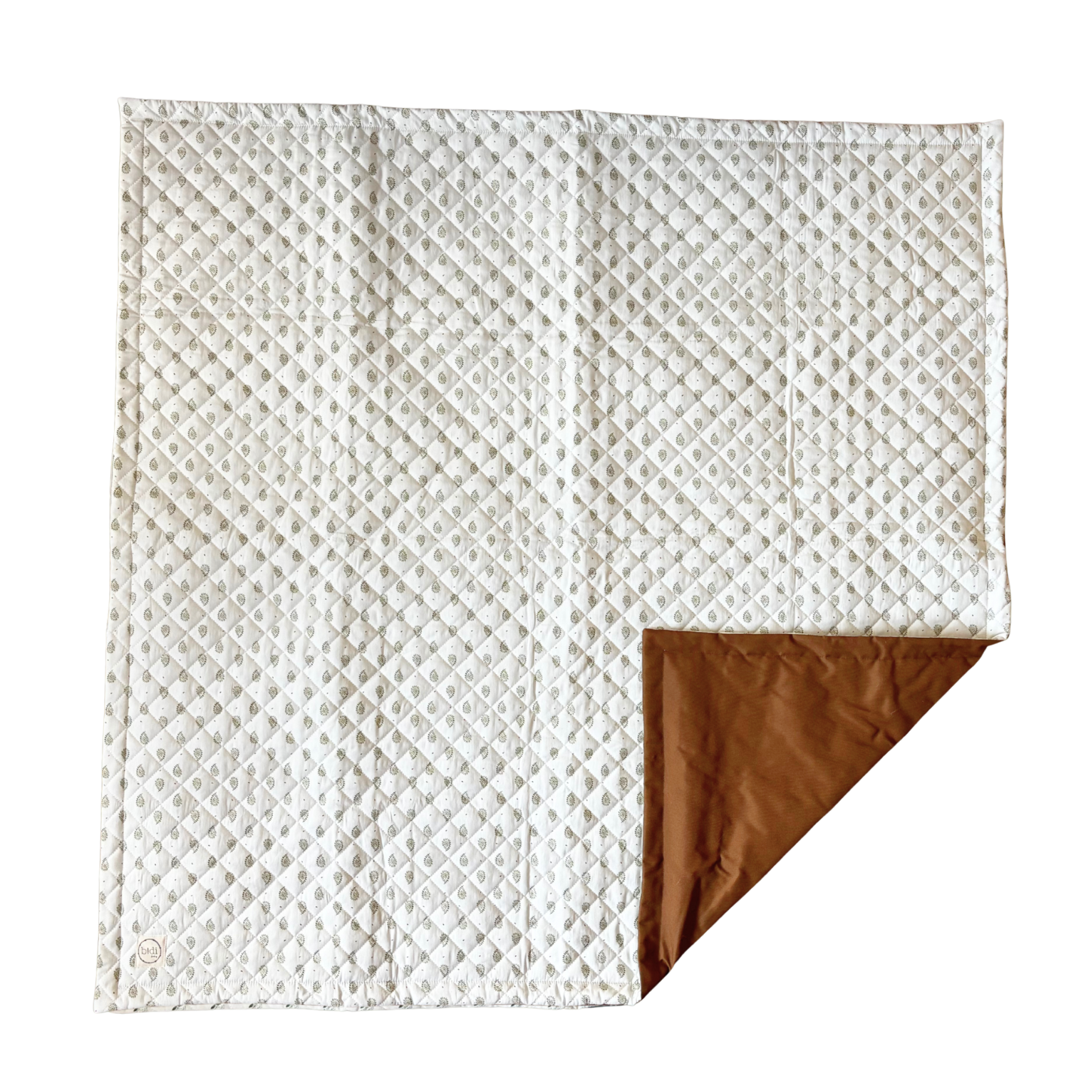 Manta de juegos con estampado silvestre en tonos verdes con un toque mandarina y con fondo color avellana en su parte inferior.