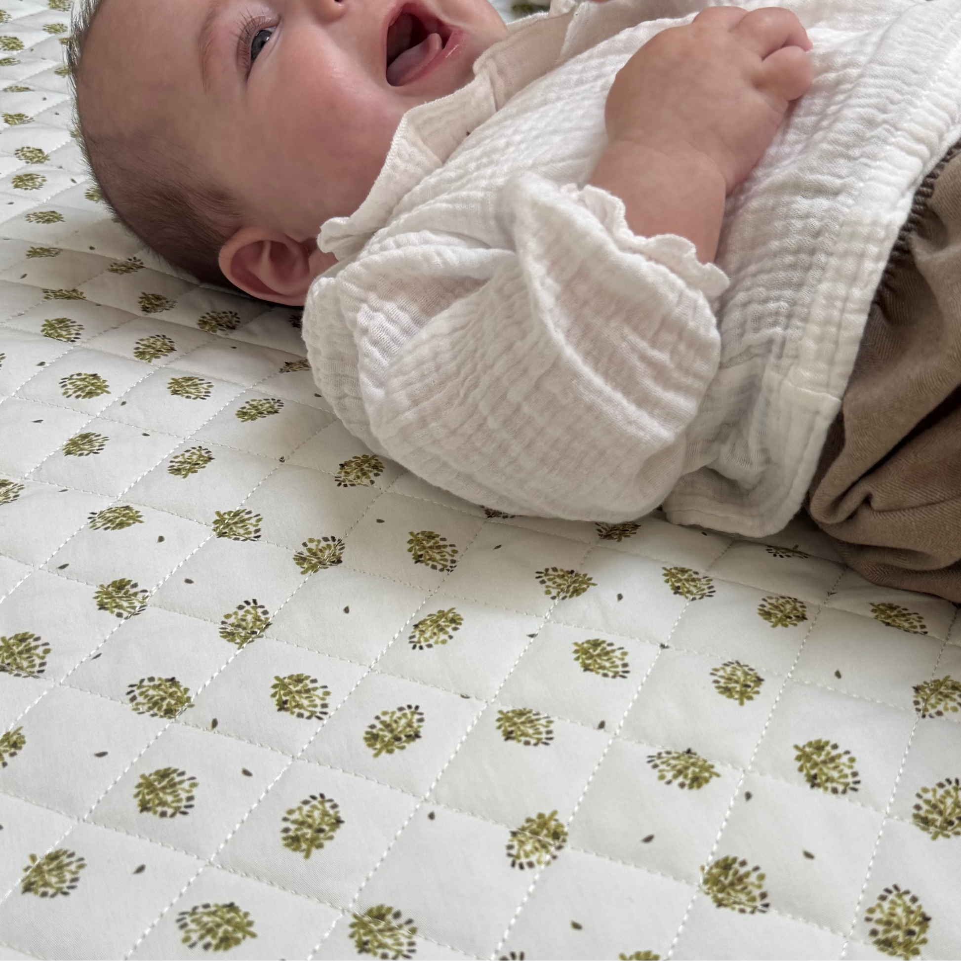 Manta de juegos con estampado de ramitas en tonos mostaza, verdes y marrones con fondo color beige en su parte inferior.
